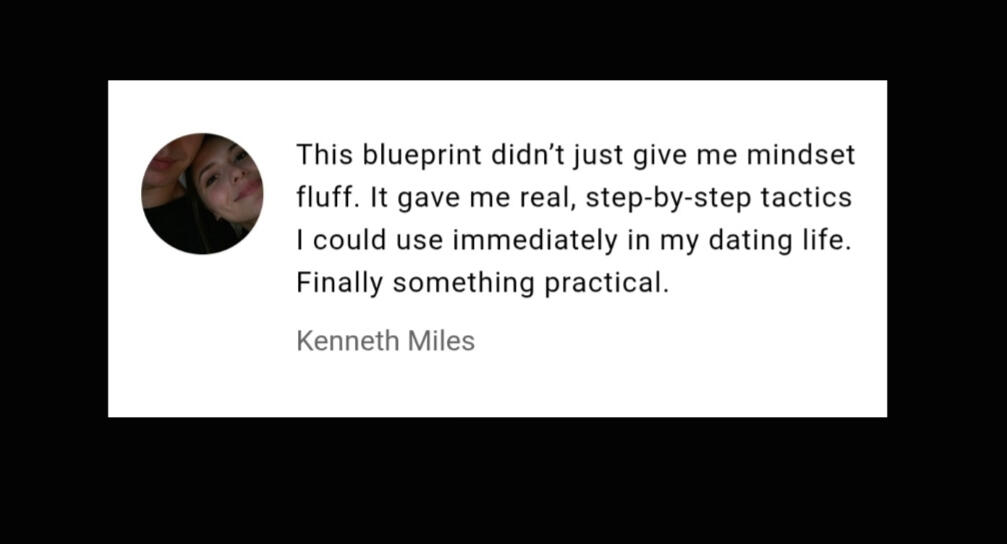 How do I know this is right for me?I had the same doubts years ago when I spent my last dollar on a dating course…And to be honest, that course wasn’t even half as good as what I’ve put inside this blueprint.But it STILL worked.Why?Because I took action. Every single day.So let me be clear:This isn’t for you if you’re just going to “hope” for results.This isn’t for you if you refuse to take action.But if you’re ready to actually apply this system, even a monkey could see success.